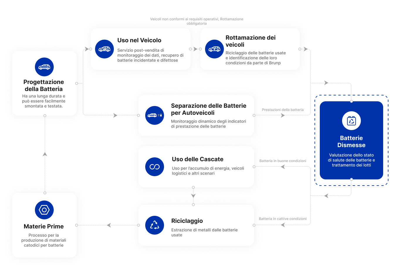 Con il supporto della sua filiale Brunp, CATL sta lavorando con i suoi clienti per creare un ciclo chiuso di produzione - applicazione - utilizzo a cascata - riciclaggio delle batterie. Allo stesso tempo, CATL è in trattative con partner europei per una cooperazione strategica incentrata sui materiali attivi catodici e sul riciclaggio delle batterie, per promuovere la localizzazione di CATL in Europa e sviluppare una catena del valore sostenibile delle batterie, contribuendo a raggiungere gli obiettivi globali di neutralità del carbonio.